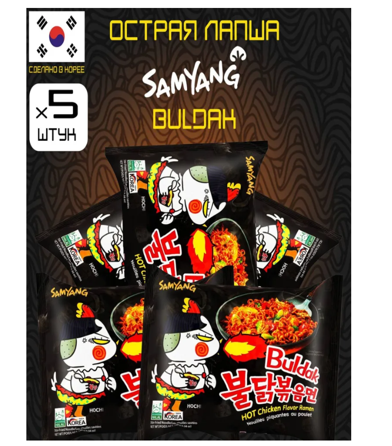 Лапша корейская быстрого приготовления острая со вкусом жгучей курицы / BULDAK SAMYANG HOT CHICKEN RAMEN / 5 штук по 140г (700г)